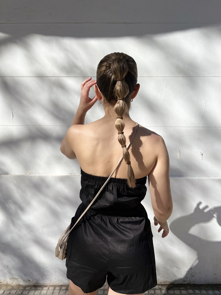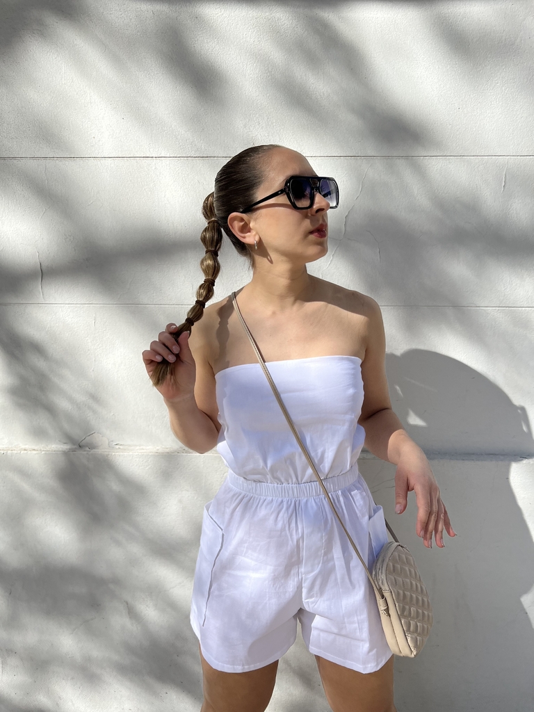 Mono de gabardina estilo cargo y sus medidas son : contorno de busto 90 cm cintura con elastico que cede hasta 90 cm caderas 110 cm largo 57 cm.