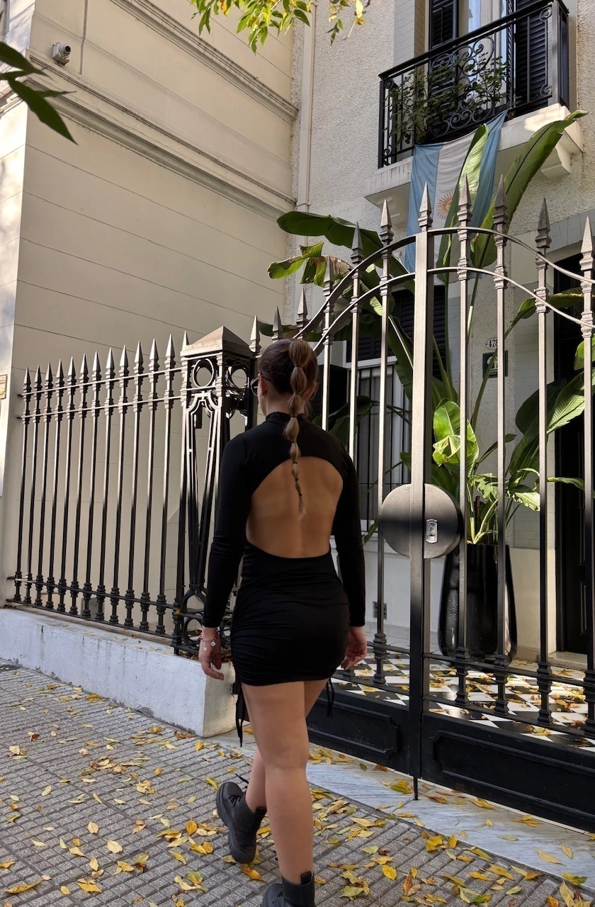 Vestido de modal soft con espalda descubierta y frunce a sus costados para regular el largo. Medidas : contorno de busto 85 cm cede hasta 110 cm largo aprox (regulable) 75 cm.